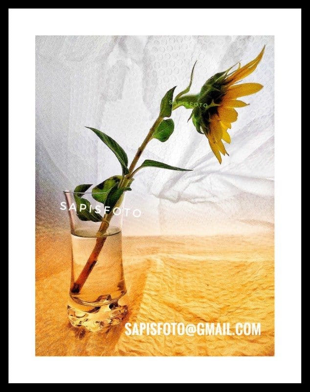 Immagine artistica intitolata Cattività: un girasole reclinato in un bicchiere d’acqua, posto in uno sfondo di plastica a bolle che lo circuisce e limita. La composizione esprime il contrasto tra natura e artificio, richiamando l’idea di cattività e fragilità, dove la naturalità appare contenuta, compressa, reclusa da un involucro industriale.